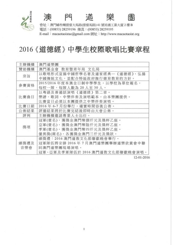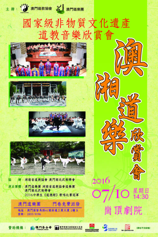 由澳門道教協會主辦的“二○一六澳門道教文化節”於十月廿二日至十一月六日舉行。吳炳鋕會長稱,一如既往安排開幕慶典、聯歡晚會、書法展、道樂展演、講座及敬老聯歡等,稍後組團赴杭州展演,藉不同形式推廣本土道教文化。