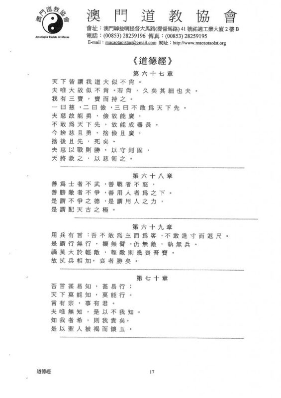 天下皆謂我道大似不肖。夫唯大故似不肖。若肖,久矣其細也夫。我有三寶,持而保之;一曰慈,二曰儉,三曰不敢為天下先。夫慈故能勇,儉故能廣,不敢為天下先,故能成器長。今捨其慈且勇,捨其儉且廣,捨其後且先,死矣,夫慈,以戰則勝,以守則固,天將救之,以慈衛之。