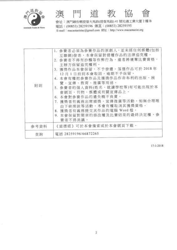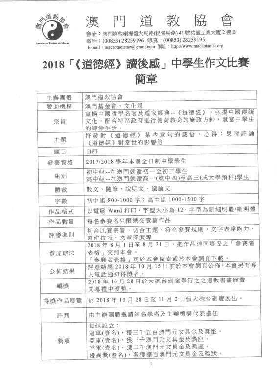 為讓中學生認識我國文化瑰寶《道德經》,弘揚中國傳統文化,配合特區政府推行德育教育的施政方針,澳門道教協會今年繼續主辦《道德經》讀後感」中學生作文比賽,各學校提交176份參賽作品,其中初中組72份及高中組104份。日前該會邀請四位對《道德經》素有研究學者–澳門管理學院院長鄭慶雲博士、澳門科技大學胡國年碩士、曾國堅老師及徐贊源老師進行評審,並選出以下優勝作品:
