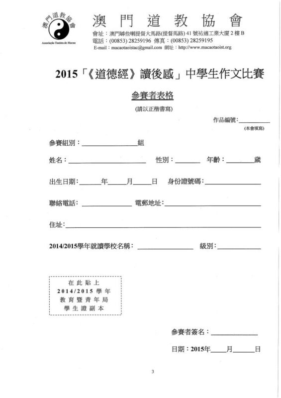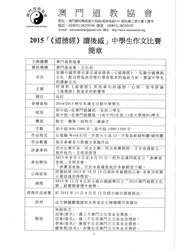 比賽章稱及報名表格,請下載:道德經徵文比賽章程2014