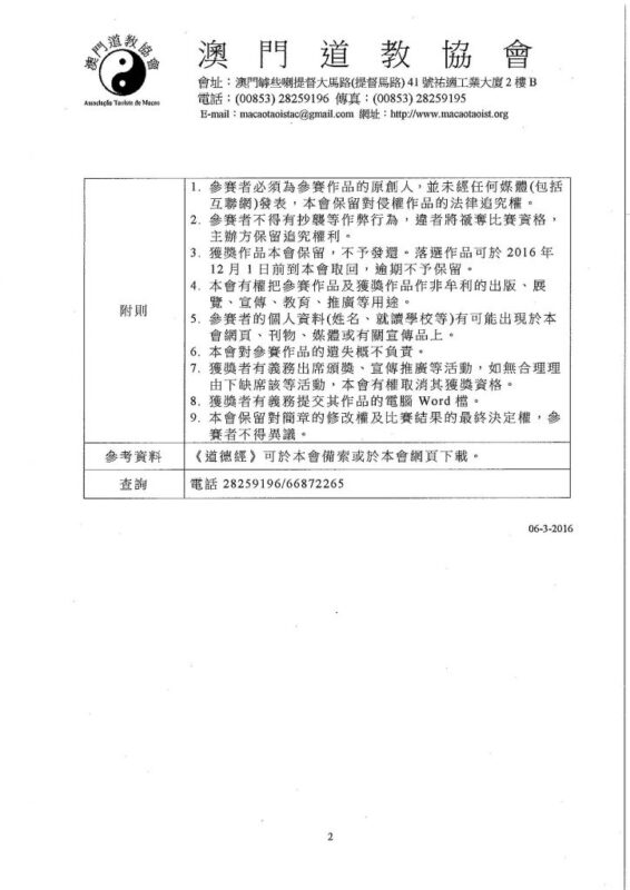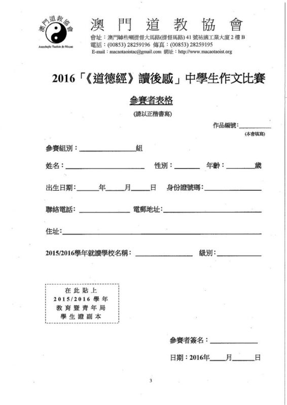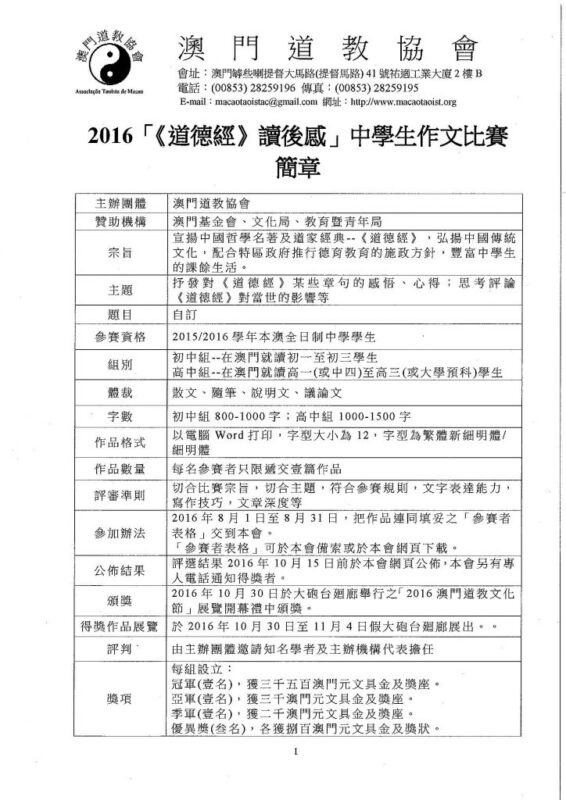 澳 道協 Posted in 「《道德經》讀後感」中學生徵文比賽, 2016澳門道教文化節, 報名表格, 最新消息, 活動消息,Tags: ,