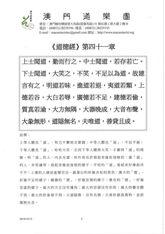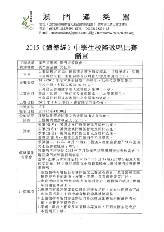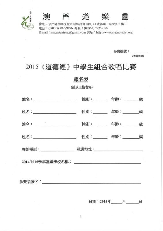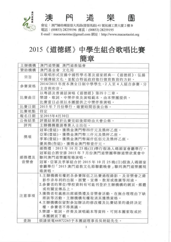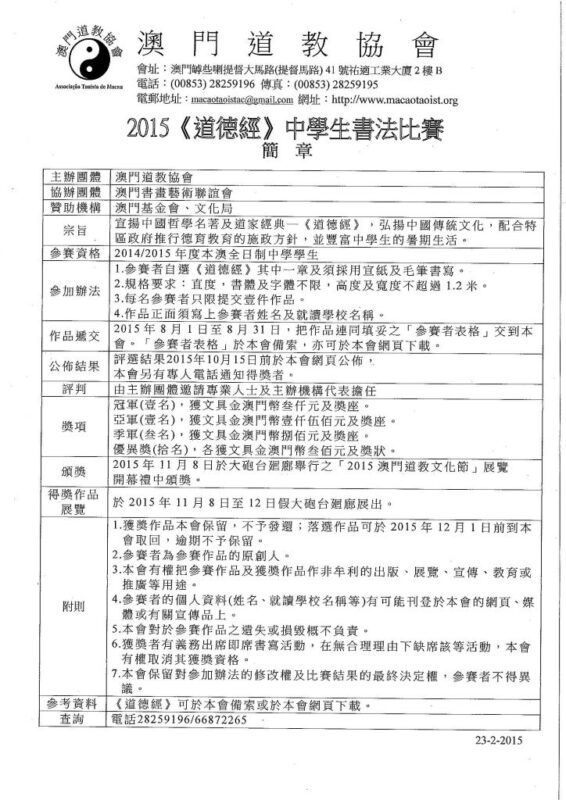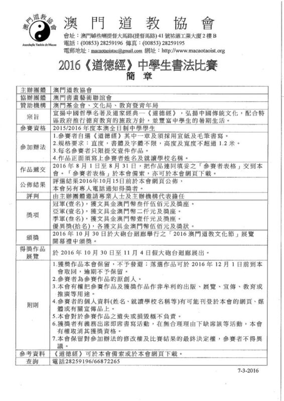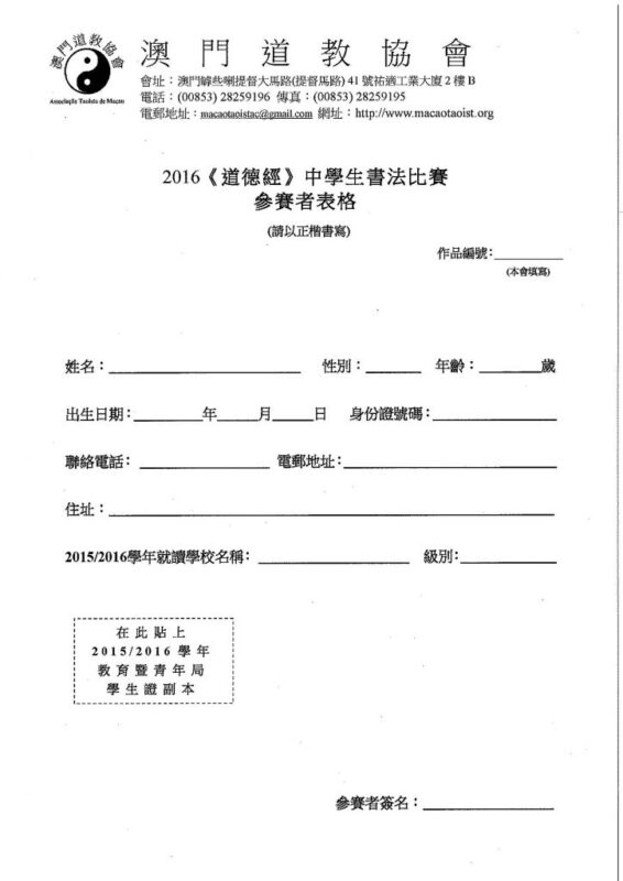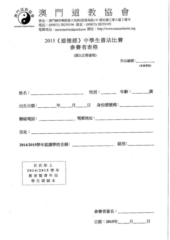 報名:每天上午九時半至十二時半,下午二時半至五時半可親臨/郵遞澳門道教協會(提督馬路41號祐適工業大廈二樓B座),或發電郵至macaotaoistac@gmail.com。報名請備身份證副本,吋半近照壹張。