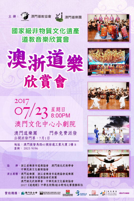 由澳門道教協會與澳門道樂團主辦,浙江省樂清市道教協會、南北武術學會、中華民族文化藝術協會協辦的“澳浙道樂欣賞會”,於2017年7月23日晚八時假文化中心小劇院舉行,現場除本澳及樂清市道樂團體參演外,還邀得本地中學歌詠團助陣,為樂迷帶來