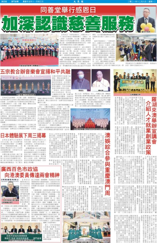 2021年11月20日 澳門五宗教音樂欣賞會 新聞發佈會 假澳門公教大會堂三院舉行。為慶祝澳門特別行政區成立22周年,澳門五宗教 — 佛敎、天主教、道教、基督教及巴哈伊教,將於12月5日下午三時,假「百老匯舞台」聯合舉行澳門首次的五宗教音樂欣賞會, 以音樂宣揚和平、大愛、共融、團結。在多月來籌備工作中 。由於防疫原因,現場觀眾須作限制,亦進行網上現場直播,讓未能入場觀眾和海內外朋友可以一同欣賞。
