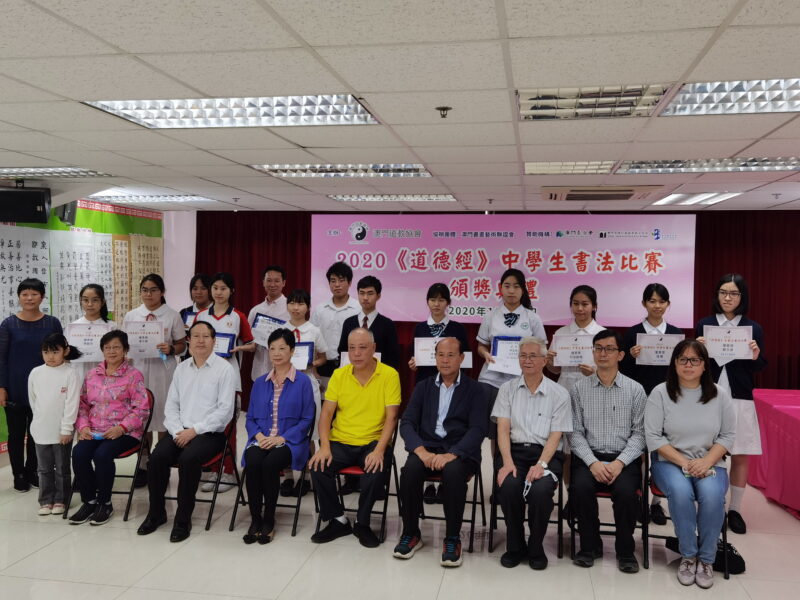 今年本會已第九年主辦「《道德經》讀後感」中學生作文比賽。月前由評審從各學校提交105份參賽作品,其中初中組55份及高中組50份選出以下優勝作品:初中組:濠江中學的吳思婷、譚語嫣、洪詠恩分獲得冠、亞、季軍,培正中學梁樂瑤、濠江中學鄧夢恬及許啓晟獲得優異獎。 高中組:濠江中學林樂賢、鄭嘉茵分獲得冠、亞軍,翁佳寧勞工子弟學校獲得季軍,濠江中學張芷菱、關婉晴、歐陽詠詩獲優異獎。二十一日城市大學李靜博士、吳炳鋕會長、葉達副會長、賴宏副會長、兩位評審曾國堅老師及徐贊源老師等為該比賽頒獎。是項比賽由澳門基金會、文化局及教育暨青年局贊助。