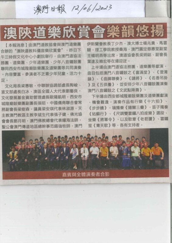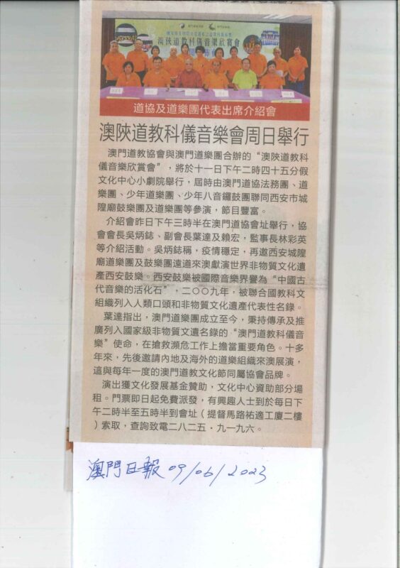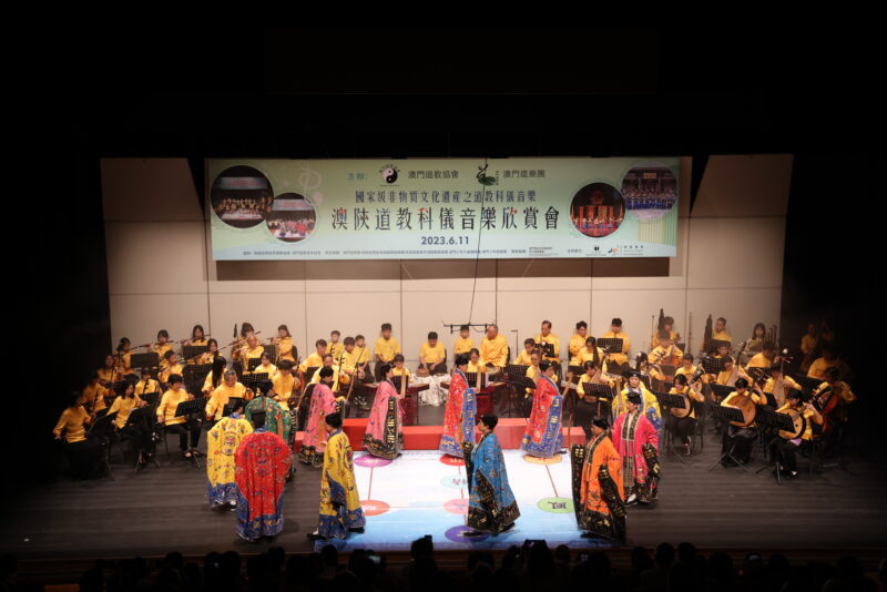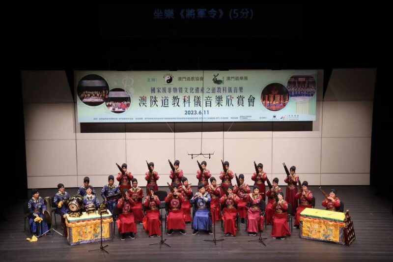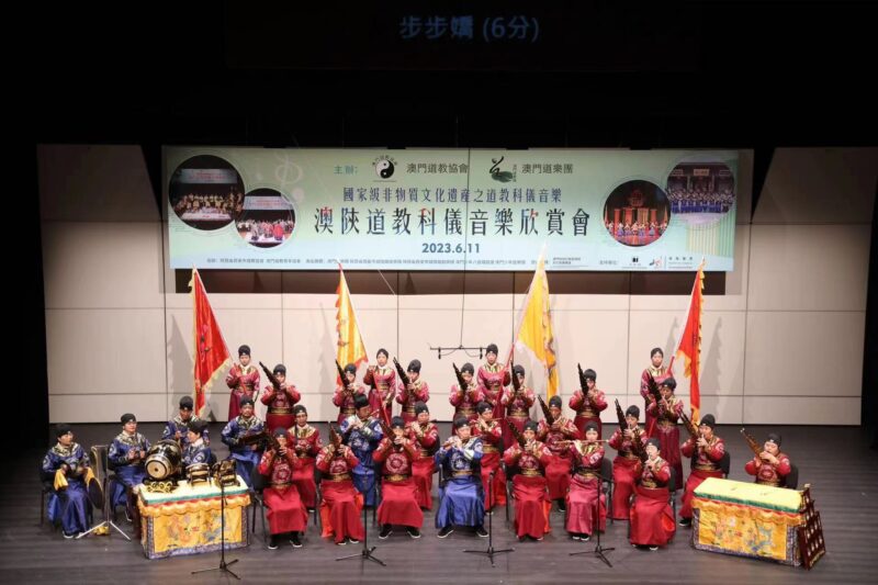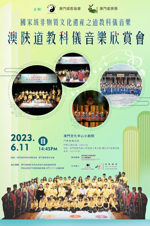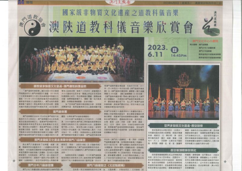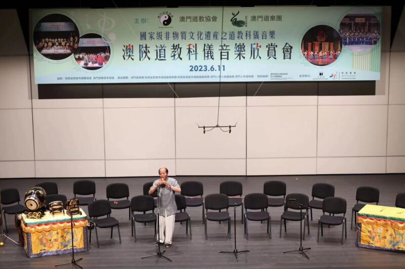 澳門道教協會與澳門道樂團合辦的“澳陝道教科儀音樂欣賞會”,已於2023年6月11日下午二時四十五分假文化中心小劇院舉行,由澳門道教協會法務團、澳門道樂團、澳門少年道樂團、澳門少年八音鑼鼓團、西安市城隍廟鼓樂團及道樂團等參演,將呈獻多首具本土特色的道樂,以及西安都城隍廟樂社曲目。