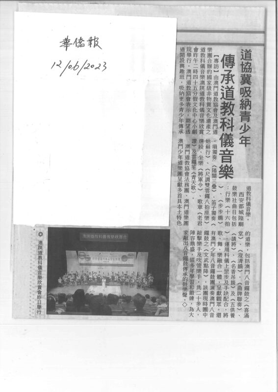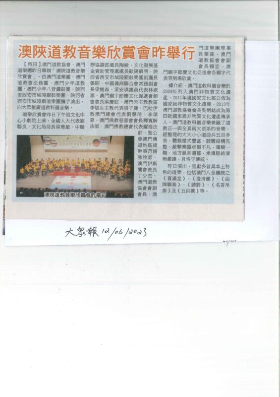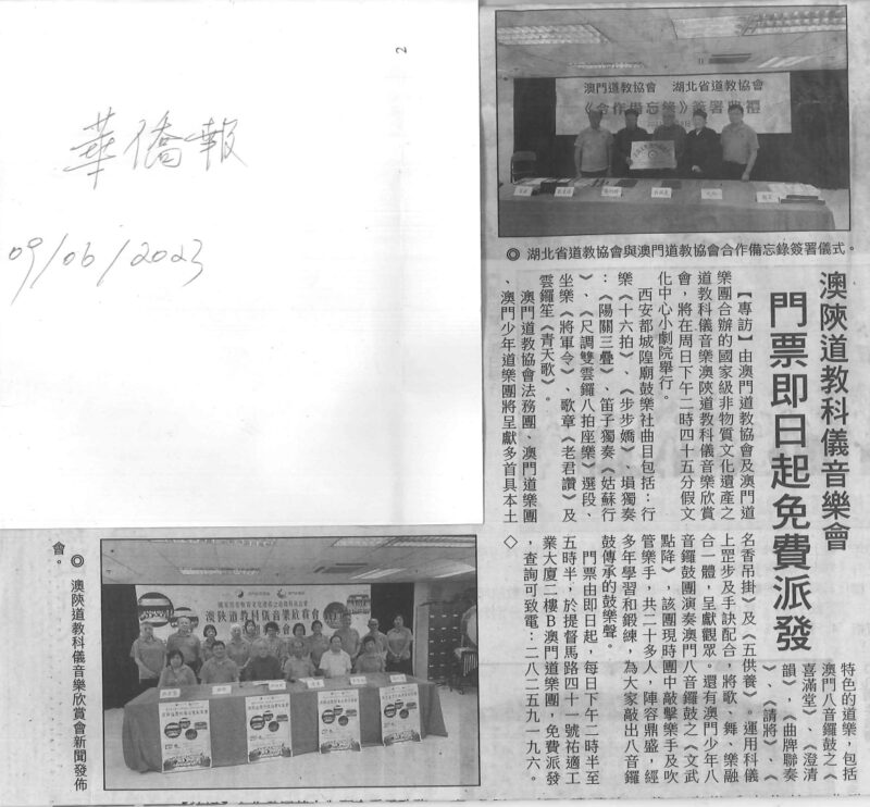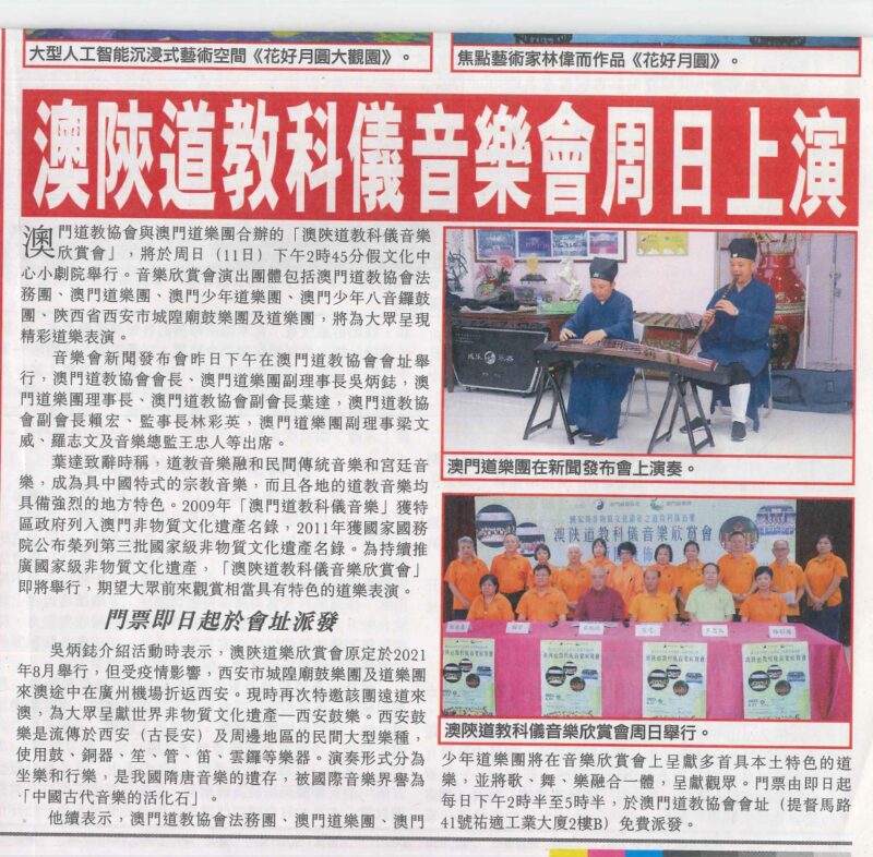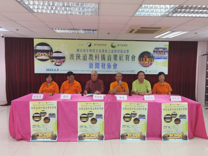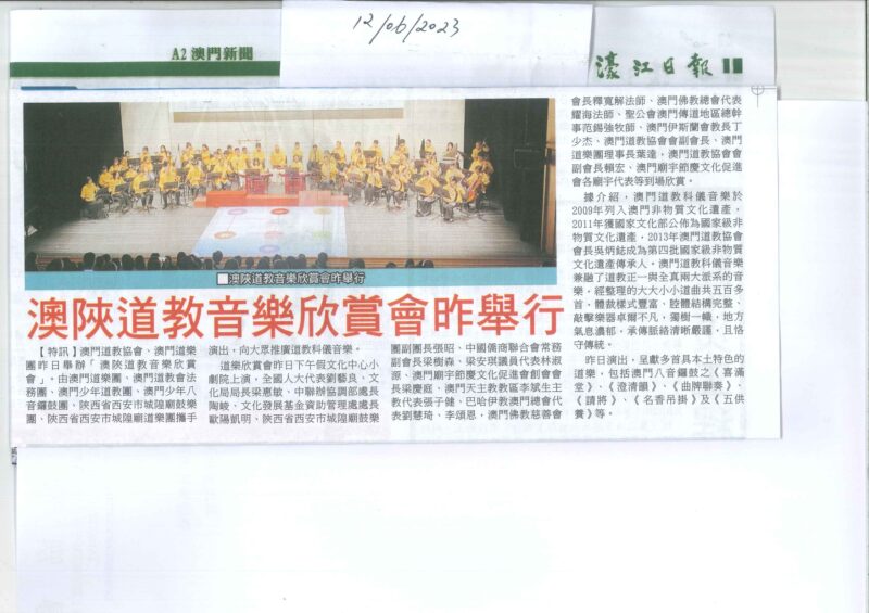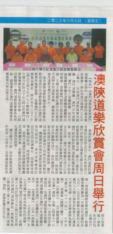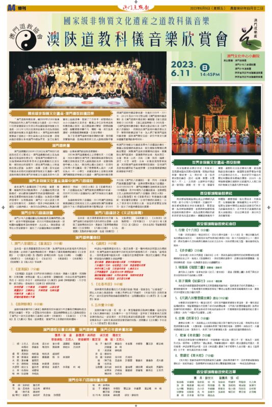 澳門道教協會與澳門道樂團合辦的“澳陝道教科儀音樂欣賞會”,已於2023年6月11日下午二時四十五分假文化中心小劇院舉行,由澳門道教協會法務團、澳門道樂團、澳門少年道樂團、澳門少年八音鑼鼓團、西安市城隍廟鼓樂團及道樂團等參演,將呈獻多首具本土特色的道樂,以及西安都城隍廟樂社曲目。