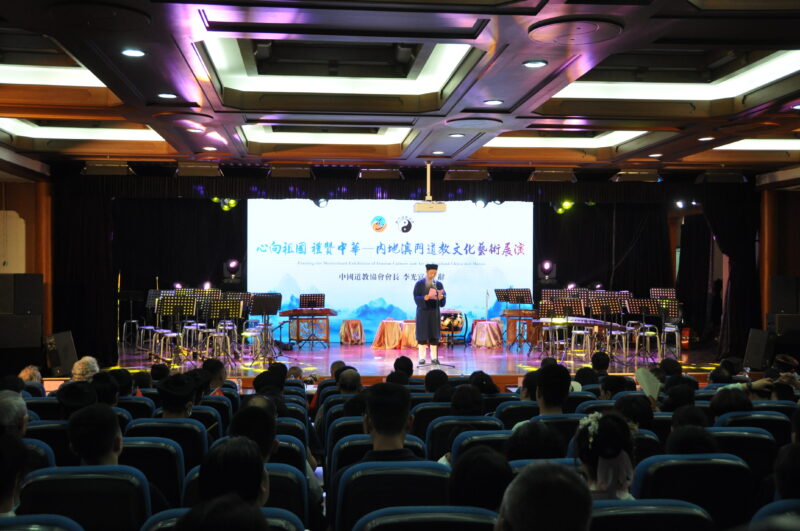澳門道樂團、澳門少年八音鑼鼓團為觀眾呈獻澳門國家級非物質文化遺產—澳門道教科儀音樂之《澄清韻》、《太乙讚》、《禮斗組曲》和澳門八音鑼鼓《朝臣大戰》、《喜慶歡騰》等八個曲目,精彩的表演贏得全場觀眾熱烈掌聲。此次進京交流,澳門道教表演團隊付出了很大努力,在七月酷熱的北京揮灑汗水,讓二百多年傳承的非遺文化和 “道教科儀音樂”這朵文明之花在首都展示。其後北京辰園演藝團隊展演《辰園四雅圖》、《武當太極》、《醉拳》和道曲《道情》等九首曲目。最後全場齊唱的《我和我的祖國》,把現場氣氛推到高潮後,圓滿陲幕。中國道教協會李光富會長設宴招待參訪團稱道教文化有着悠久的歷史和深厚的內涵,是中華文明的重要組成部分。道教音樂是道教文化的表現載體,既表達了道教哲理教義,傳遞出了千年東方的美學思想,形成了自己鮮明的藝術特色,喜見眾多青少年隨團交流傳承道教文化,實可喜可賀。