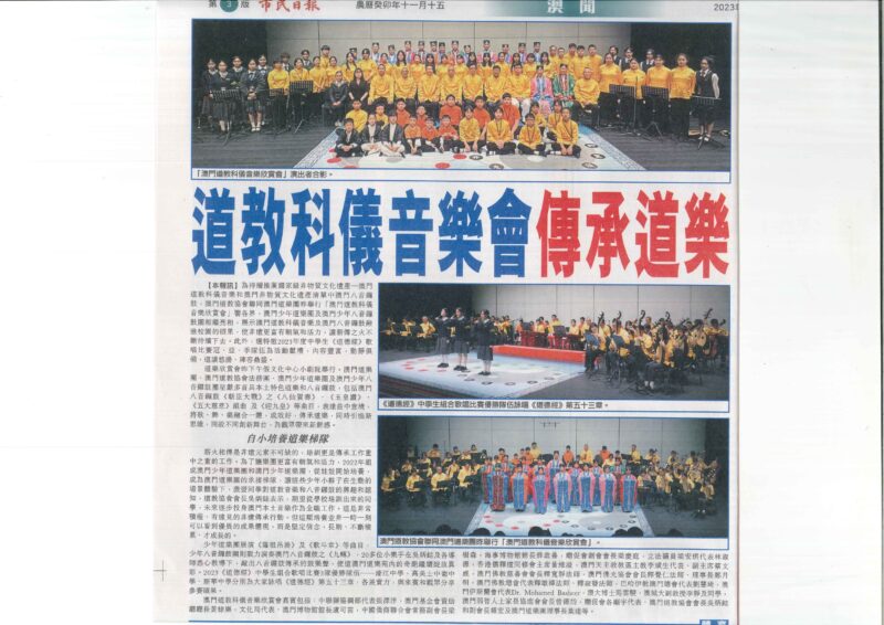 由澳門道教協會、澳門道樂團主辦,陝西省西安市道教協會、澳門道教青年協會協辦的“澳陝道教科儀音樂欣賞會”於2023年6月11日,假澳門文化中心小劇院舉行,音樂欣賞會由澳門道教協會法務團、澳門道樂團、澳門少年道樂團、澳門少年八音鑼鼓團、西安市城隍廟鼓樂團及道樂團等參演,呈獻多首具本土特色的道樂,以及西安都城隍廟樂社曲目,內容豐富。參演者不乏青少年兒童,活力十足。吸引三百多人入場欣賞。