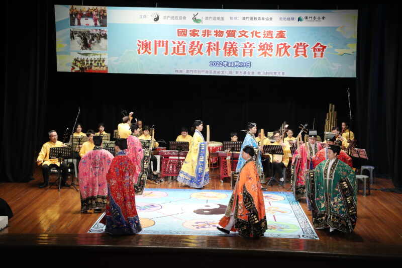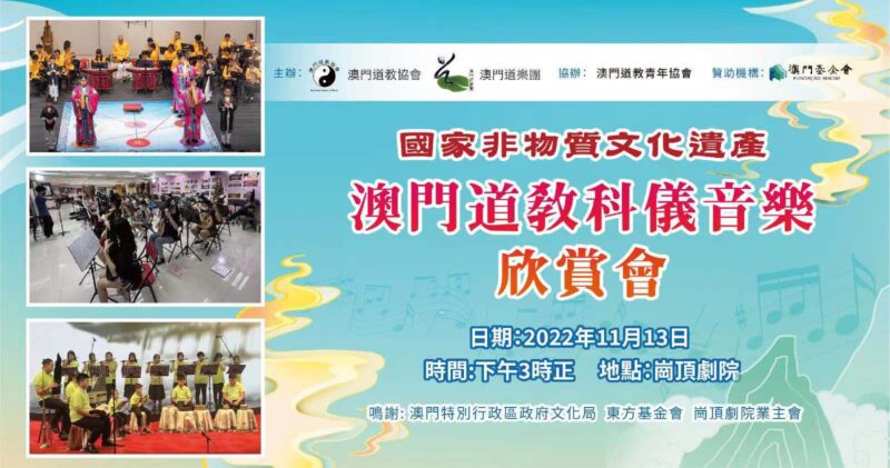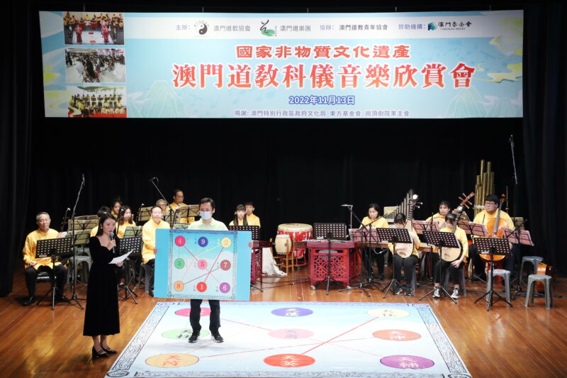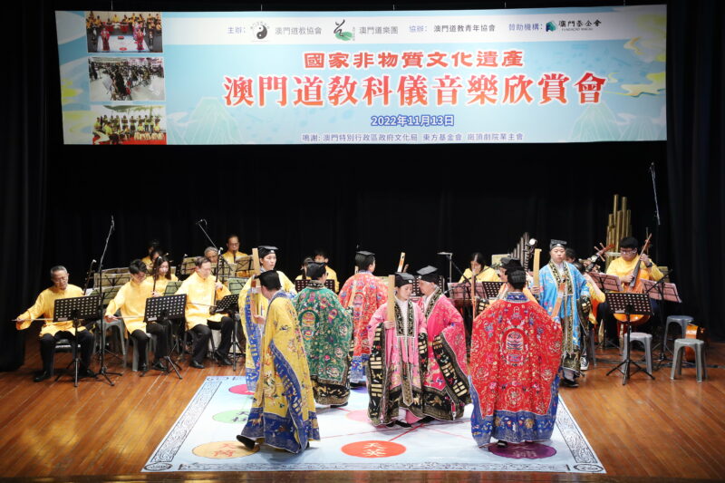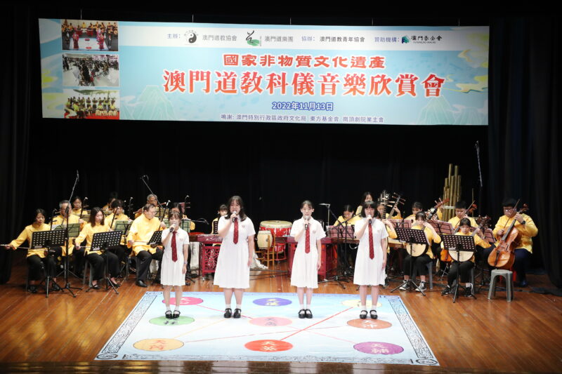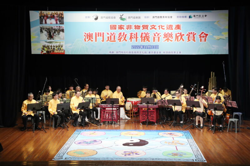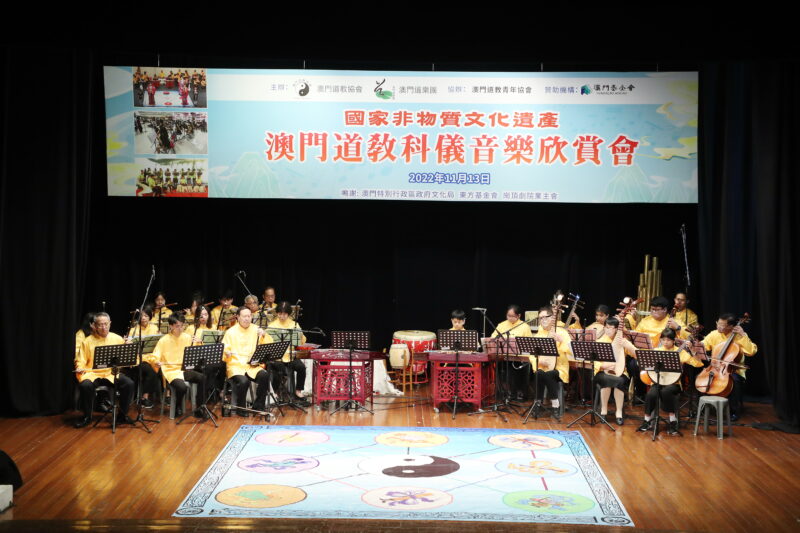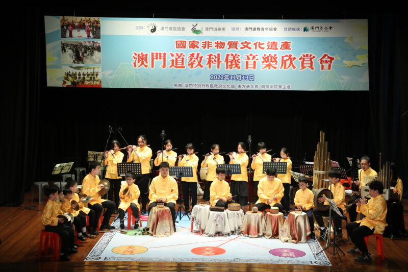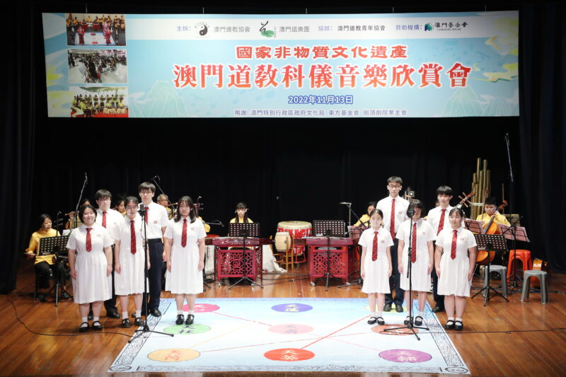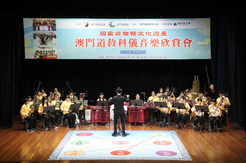 為持續推廣國家級非物質文化遺產–澳門道教科儀音樂和澳門非物質文化遺產清單中澳門八音鑼鼓,澳門道教協會聯同澳門道樂團今日舉行“澳門道教科儀音樂欣賞會”饗各界,澳門少年道樂團及澳門少年八音鑼鼓團相繼亮相,展示澳門道教科儀音樂及澳門八音鑼鼓融進校園的碩果,使非遺更富有朝氣和活力,讓薪傳之火不斷持續下去。此外,還特邀2022度中學生《道德經》歌唱比賽優勝隊伍為活動獻禮,內容豐富,靜動俱備,道韻悠揚、陣容鼎盛。