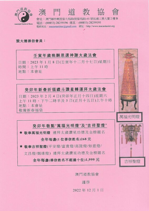 各位大德善信:奉達今年歲晚還神及明年新春祈福通知,誠邀屆時蒞臨酬神祈福,祝身心康泰,萬事如意。