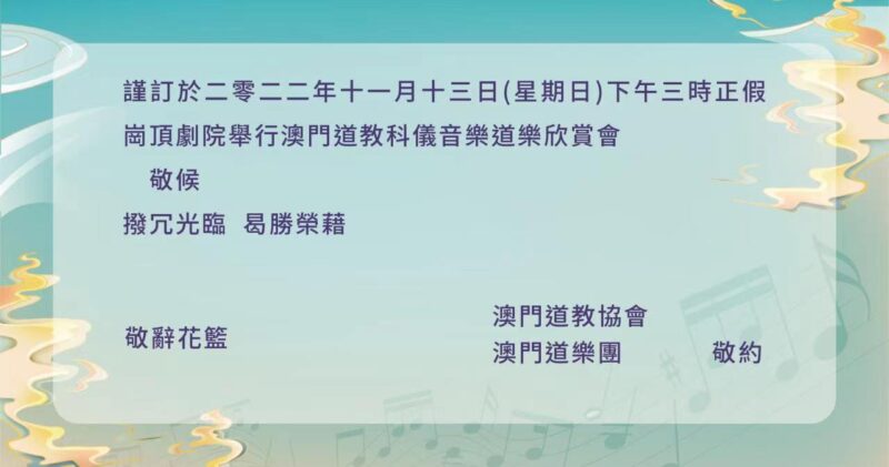 誠邀13/11(日),下午三時,蒞臨崗頂劇院,岀席澳門道教科儀音樂欣賞會,支持國家非遺及青少小夥子承傳本土音樂。