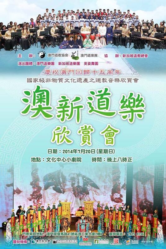 持續推廣國家級非物質文化遺產「澳門道教科儀音樂」及慶祝澳門特區成立十五周年,澳門道樂團於720日誠邀新加坡道樂團蒞澳舉辦澳新道教音樂欣賞會。新加坡道樂團成立於2003年是中國以外的第一支海外道樂團。該道樂團今次來澳包括:樂團、法務團及太極團成員共50位,除演奏全真派道樂外,還有富新加坡特色的福建和海南道樂及武當太極配合道樂表演。曲目包括:太極韻 百家春樂逍遙雲樂歌吊掛韻三寶詞將水