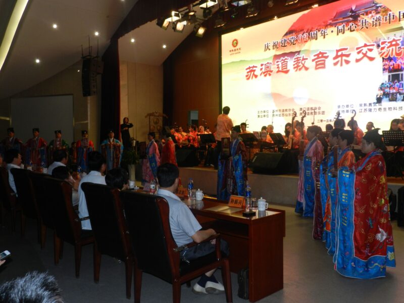 澳門道教協會聯同澳門道樂團,於8月1日至6日應江蘇省宗教事務局及江蘇道教協會之邀,一行40多人在中聯辦處長崔曉忠陪同下,出訪南京、金壇、鎮江、揚州、蘇州及常熟進行道教文化及音樂交流活動。在蘇期間受到江蘇省道教協會會長楊世華,蘇州道教協會會長張鳳林等熱情款待,亦分別獲江蘇省宗教事務局副局長沈祖榮、金壇市副市長王艷紅、金壇市統戰部部長吳欲曉、蘇州市統戰部副部長金建立、常熟市統戰部部長王永明、常熟市宗教局局長曹國良、常熟市辛莊鎮黨委書記丁琪及江蘇省隆力奇集團董事長徐之偉等領導接見。