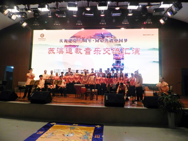 在常熟澳門道樂團及蘇州姑蘇道樂團應當地真武觀及江蘇省隆力奇集團之邀,為慶祝建黨92周年、同心共譜中國夢,假隆力奇集團會堂舉行”蘇澳道教音樂交流匯演”。蘇州市統戰部副部長金建立、常熟市統戰部部長王永明及江蘇省隆力奇集團董事長徐之偉等出席盛會,全場爆滿。兩項國家非物質文化遺產的道樂同臺和鳴,交相輝映,共綻異釆,當地居民及信眾皆沉醉富於獨特的嶺南傳統道教音樂與融合江南絲竹和吳韻的姑蘇道曲中。《將軍令》是蘇州姑蘇道樂團遐邇聞名的《十番鑼鼓》吹打樂,曲調雄壯,氣氛熱烈。而澳門道樂團的《文武點絳脣》,以吹打樂的形式縯繹澳門吉祥道場上具代表性的閙臺‘耍曲’。此曲除了道教傳統曲目外,更融合了廣東粵劇傳統的《玉皇登殿》、《六國封相》及點將排場的曲牌,包括《粉蝶兒》、《再飲宴引》、《火炮頭》、《穿禾鵲引》、《長尾聲》、《短尾聲》、《小開門》及《剔銀燈》等。以吳炳鋕會長為領軍的吹打樂組合,由鼓、鑼、鑔、鈸、鐺、嗩吶、竹笛、笙、號筒及牛角組成。鼓除了大鼓、堂鼓、板鼓,還使用了現時已少用的沙鼓(文頭)、雙皮鼓等。全曲以多套鑼鼓經穿插連接,結構嚴謹,套路明晰,一氣呵成,盡顯嶺南節慶音樂的傳統。蘇州道教協會會長張鳳林讚譽澳門道樂團是次無論在樂隊編制,曲目編配及表演形式上,與數年前相比,士別三日,令人刮目,實令人喜出望外。