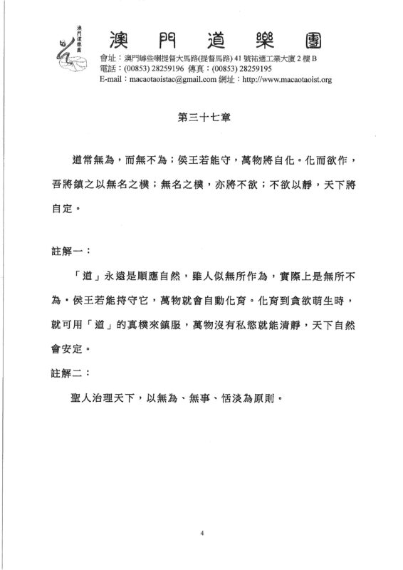 澳門道樂團呈獻了多首具本土特色的道樂,包括澳門八音鑼鼓之《朝臣大戰》之排朝、《太乙讚》、《禮謝》、《五供養》、《禮斗組曲》等。《禮謝》一曲採用具廣東特色吟誦說唱方式–南音和木魚,唱出澳門正一派《禮斗科儀》末段,上謝諸神聖眾降臨,信眾蒙福沾恩,赦除罪業,祈祐家宅安寧、福壽康齡的內容。今次曲目亦運用科儀上罡步及手訣配合,將歌、舞、樂融合一體。2018《道德經》中學生校際歌唱比賽及組合冠軍–勞工子弟學校詠唱團 中葡高美士中學詠唱團同台分別獻唱得獎樂曲王忠人教授新作品–《道德經》第三十九章和第四十章。