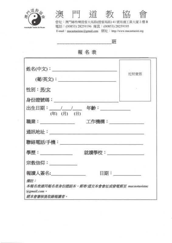 • 經被接納參加後,可與導師商議上課時間。報名:於網站:www.macaotaoist.org瀏覽下載表格報名;每天下午二時半至五時半到本團報名或傳真/電郵報名表格至本團。