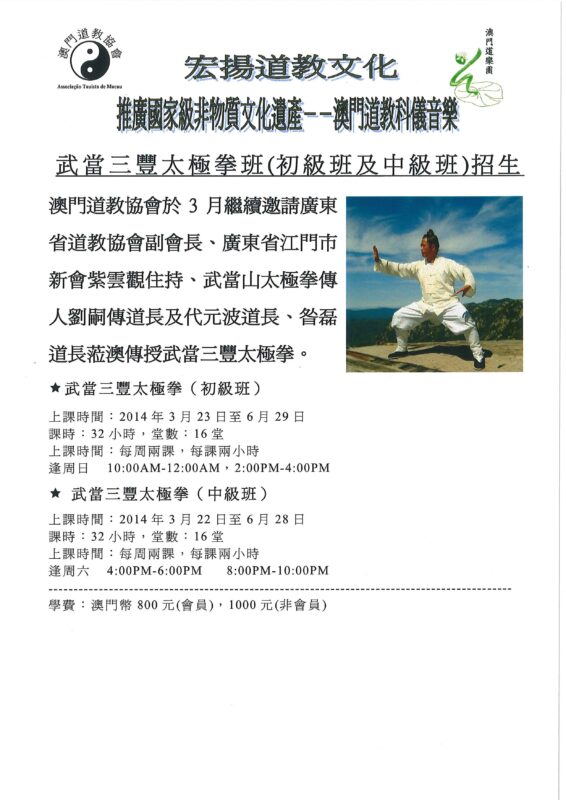 澳門道教協會於3月繼續邀請廣東省道教協會副會長、廣東省江門市新會紫雲觀住持、武當山太極拳傳人劉嗣傳道長及代元波道長、昝磊道長蒞澳傳授武當三豐太極拳,課程分為初級班及中級班。