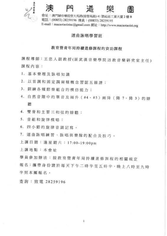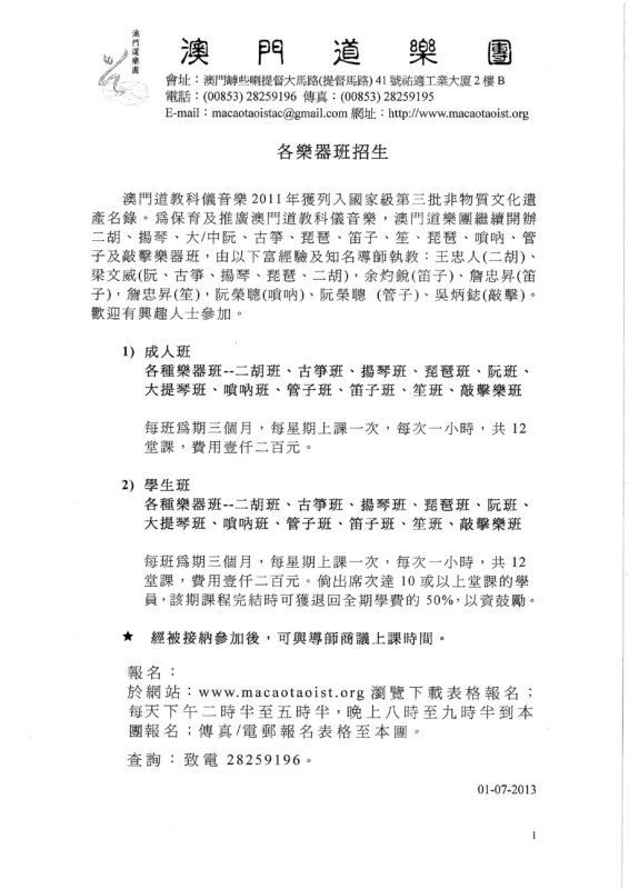 澳 道協 Posted in 國家級非物質文化遺產, 報名表格, 最新消息, 本會課程, 澳門道樂團,Tags: ,