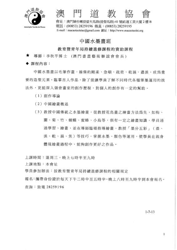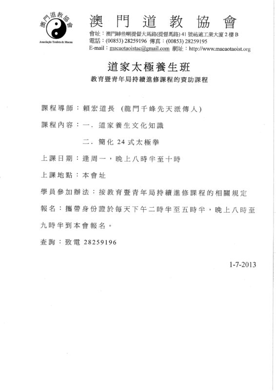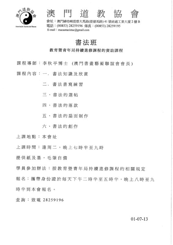 各項課程章程及報名表格歡迎親臨/傳真/電郵澳門道教協會 索取或於網站:www.macaotaoist.org瀏覽下載