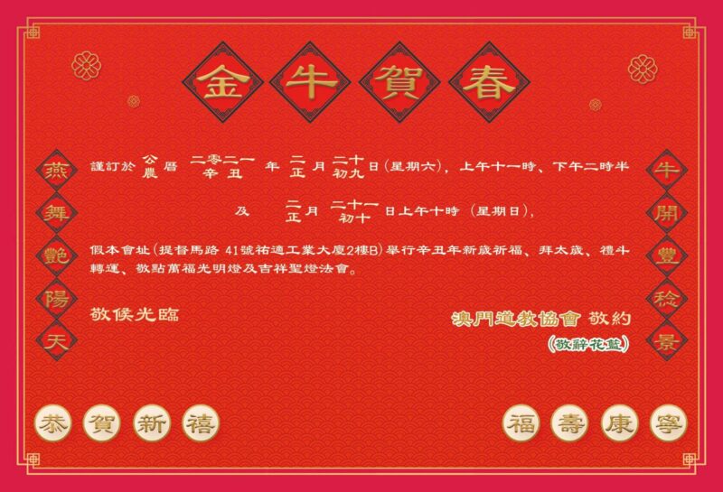 本會於2021年2月20日及21日(年初九及初十) ,假會址舉行“辛丑年新歲祈福、禮斗祝星、拜太歲、敬點萬福光明燈及吉祥聖燈法會”,本會舉辦新春祈福法會多年,藉此表達對上天諸神崇敬,祈求神明賜福延齡,弘揚中國傳統文化。鑑於疫情仍未結束,還望新一年經濟與社會盡快恢復正常,一切順利。法會由本會法務團演法及澳門道樂團十多位團員在場伴奏,壇場莊嚴,道韻悠揚。