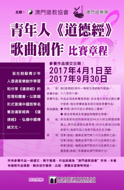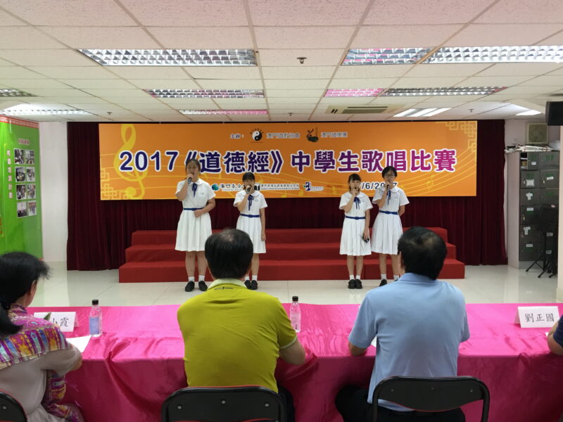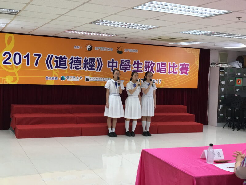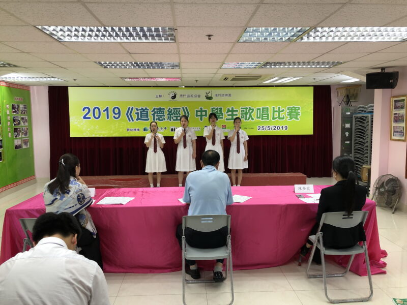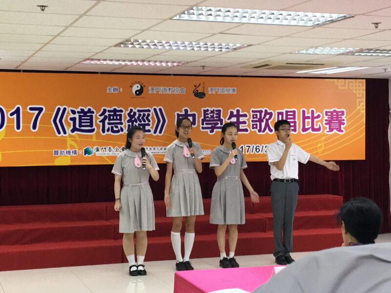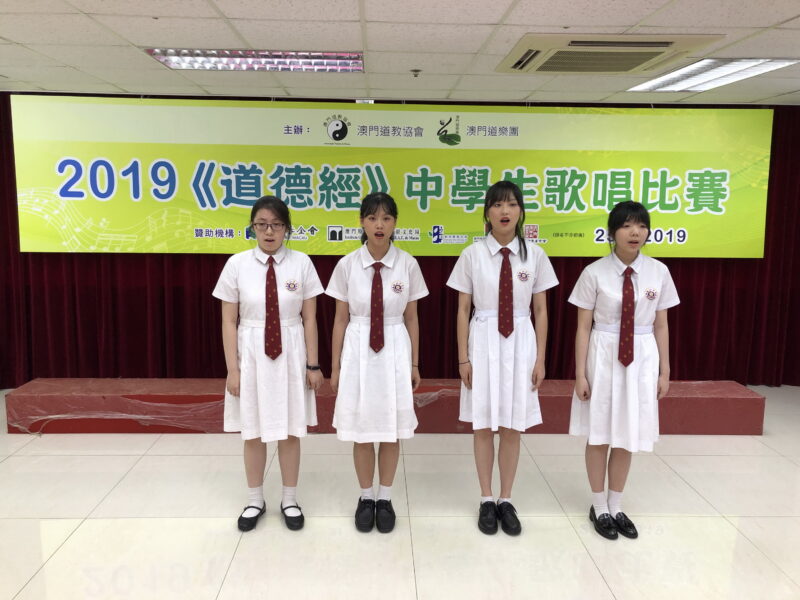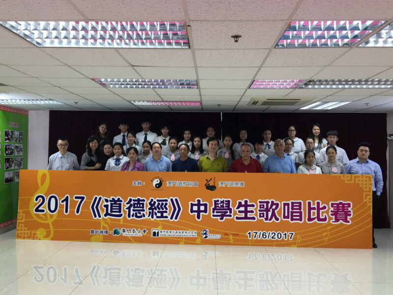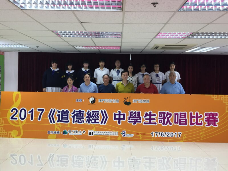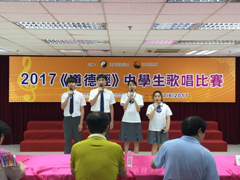 澳門道教協會及澳門道樂團自2011年起,舉辦《道德經》中學生校際及組合歌唱比賽,以讓中學生認識我國文化瑰寶《道德經》,弘揚中國傳統文化,配合特區政府推行德育教育的施政方針。今年比賽於6月10日假澳道協會址舉行,各參賽隊伍及組合同學以粵語及普通話分別演唱由澳門道樂團音樂總監王忠人副教授創作撰寫《道德經》第二十一章(校際歌唱比賽)和第二十三章(組合比賽) 。經由李廣達教授(深圳大學聲樂教授)、劉正國教授(上海師範大學音樂學院教授) 、王忠人副教授及彭小霞老師(原湖北省文聯創作室副主任) 組成專業評審團評出本屆優勝隊伍: