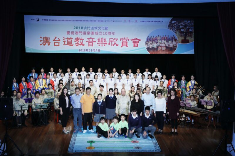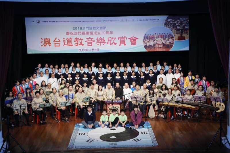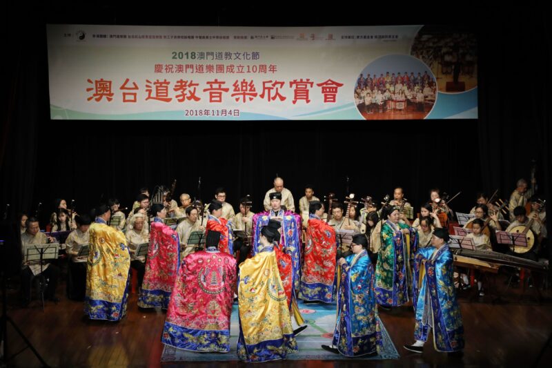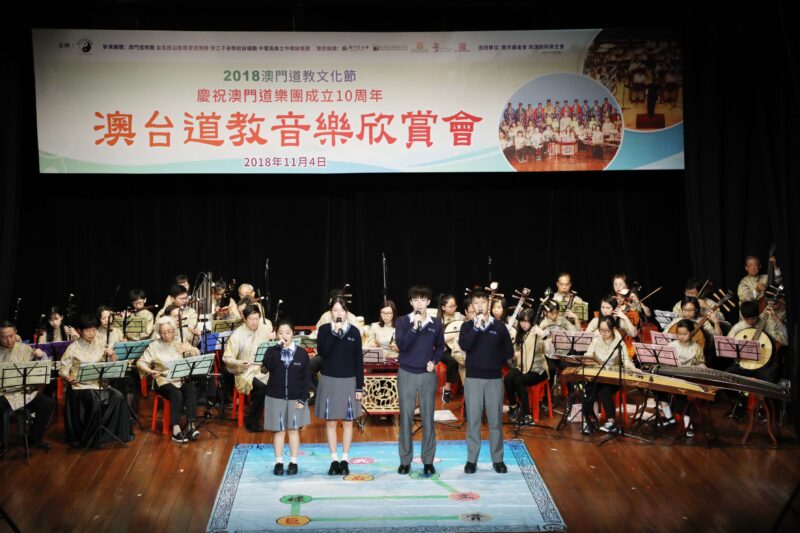 澳門道樂團呈獻了多首具本土特色的道樂,包括澳門八音鑼鼓之《朝臣大戰》之排朝、《太乙讚》、《禮謝》、《五供養》、《禮斗組曲》等。《禮謝》一曲採用具廣東特色吟誦說唱方式–南音和木魚,唱出澳門正一派《禮斗科儀》末段,上謝諸神聖眾降臨,信眾蒙福沾恩,赦除罪業,祈祐家宅安寧、福壽康齡的內容。今次曲目亦運用科儀上罡步及手訣配合,將歌、舞、樂融合一體。2018《道德經》中學生校際歌唱比賽及組合冠軍–勞工子弟學校詠唱團 中葡高美士中學詠唱團同台分別獻唱得獎樂曲王忠人教授新作品–《道德經》第三十九章和第四十章。