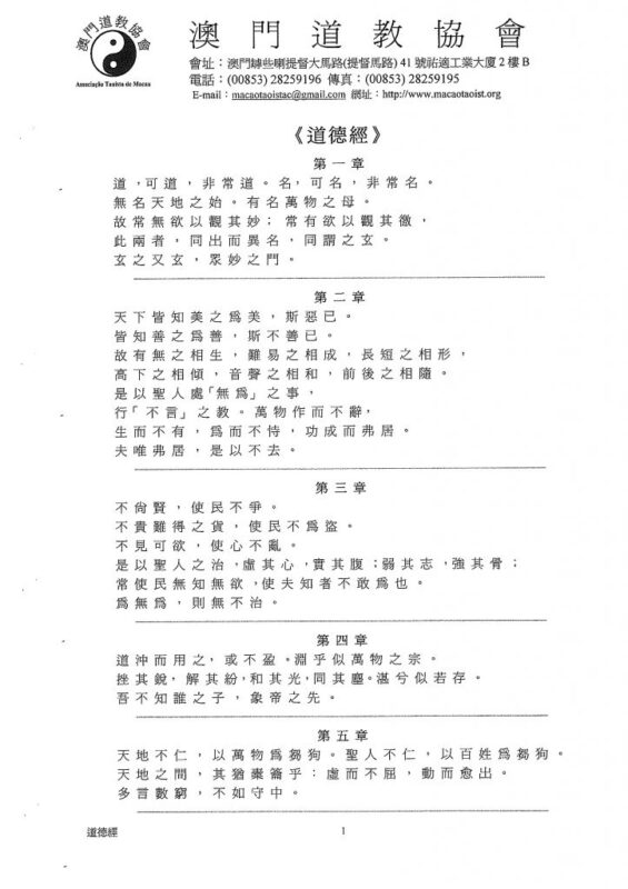道 ,可 道 , 非 常 道 。 名, 可 名 , 非 常 名 。無 名 天 地 之 始 。 有 名 萬 物 之 母。 故 常 無 欲 以 觀 其 妙 ﹔ 常 有 欲 以 觀 其 徼 ,