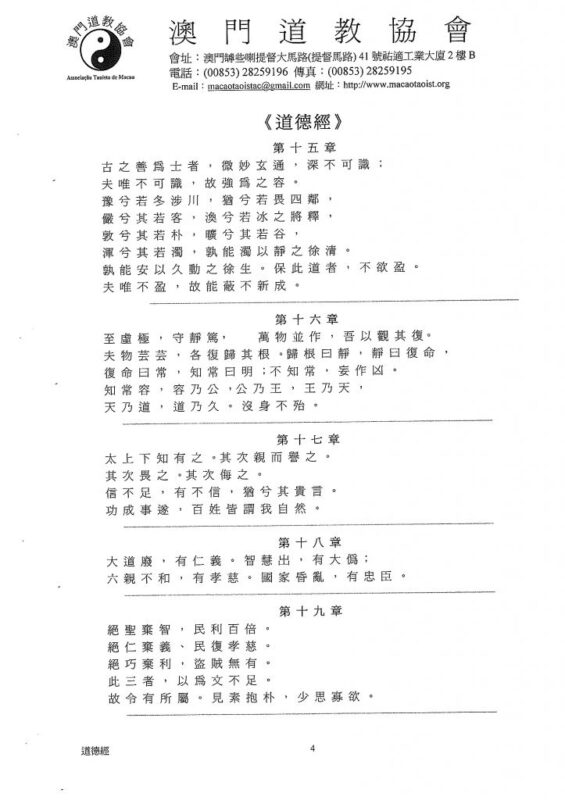 道 沖 而 用 之, 或 不 盈 。淵 乎 似 萬 物 之 宗 。挫 其 銳, 解 其 紛,和 其 光,同 其塵。 湛 兮 似 若 存 。吾 不 知 誰 之 子 , 象 帝 之 先 。