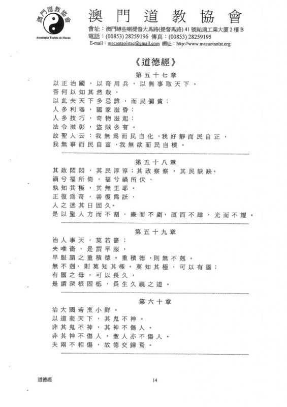以 正 治 國 , 以 奇 用 兵 , 以 無 事 取 天 下 。吾 何 以 知 其 然 哉 ,以 此 夫 天 下 多 忌 諱 , 而 民 彌 貧 ﹔人 多 利 器 , 國 家 滋 昏 ﹔ 人 多 技 巧 , 奇 物 滋 起 ﹔法 令 滋 彰 , 盜 賊 多 有 。故 聖 人 云 : 我 無 為 而 民 自 化 ,我 好 靜 而 民 自 正 ,我 無 事 而 民 自 富 ,我 無 欲 而 民 自 樸 。