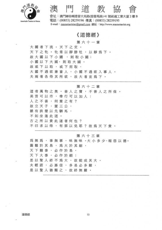 大 國 者 下 流 。 天 下 之 交 。天 下 之 牝 。 牝 常 以 靜 勝 牡 , 以 靜 為 下 。故 大 國 以 下 小 國 , 則 取 小 國 ﹔小 國 以 下 大 國, 則 取 大 國 。 故 或 下 以 取 , 或 下 而 取 ,大 國 不 過 欲 兼 畜 人 , 小 國 不 過 欲 入 事 人 。夫 兩 者 各 得 其 所 欲 , 故 大 者 宜 為 下 。