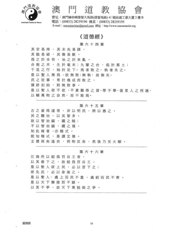 合 抱 之 木 , 生 於 毫 末 ﹔九 層 之 台 , 起 於 累 土 ﹔千 里 之 行, 始 於 足 下。 為 者 敗 之, 執 者 失 之。 是 以 聖 人無 為 ,故 無 敗;無 執, 故 無 失。 民之 從 事 , 常 於 幾 成 而 敗 之 。慎 終 如 始 , 則 無 敗 事 。 是 以 聖 人 欲 不 欲 ,不 貴 難 得 之 貨,學 不 學,復 眾 人 之 所 過,以 輔 萬 物 之 自 然, 而 不 敢 為。